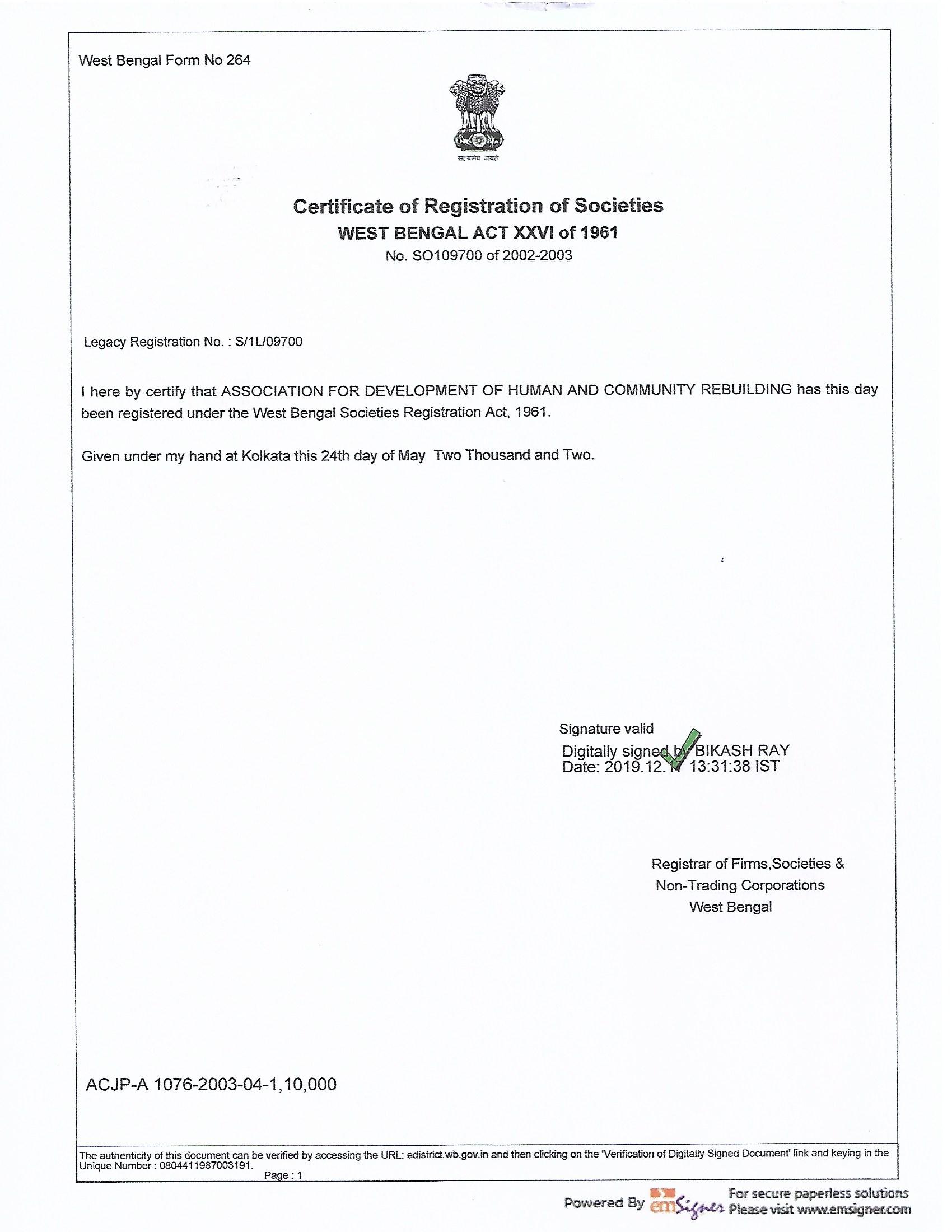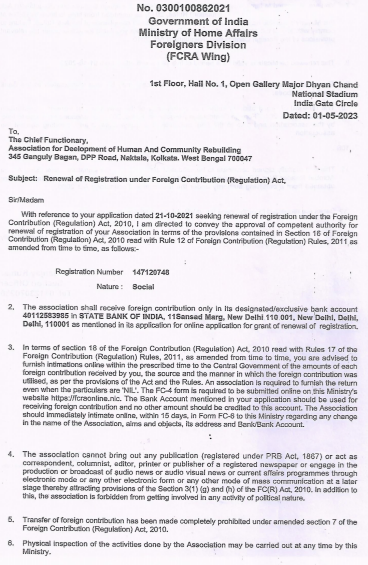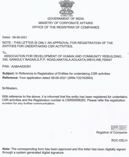 Legal Documents Adhar Society Registration Certificate View CSR-1 Registration View FCRA Renewal View